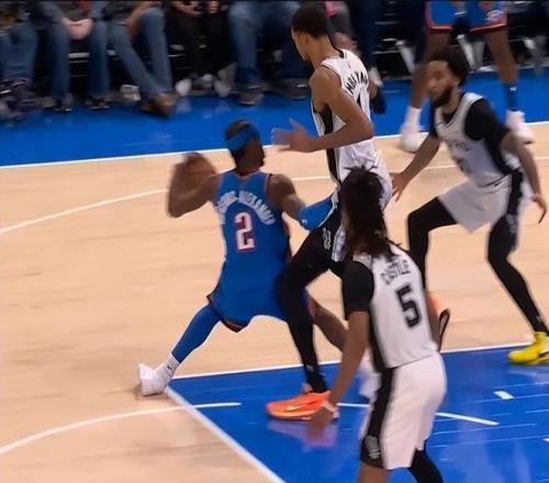 本来这球文班这个位置抢下前场板,可以直接发动进攻了,可是没想到亚历山大又来了一个新动作,叫夹腿动作,这个动作非常凶狠,夹着你的腿,那你能动吗?这种夹腿直接把人放倒,我们在之前的比赛里基本上都是看不见的,更不要说当家核心球员亲自去这么干,结果没有想到亚历山大,竟然真的亲自去这么干了。对对手超巨用剪刀腿,放在哪个联赛里都是不能被允许的。