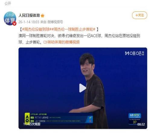 据@人民日报体育 消息,澳网一球制胜首轮对决,彼得·约维奇发出一记ACE球,周杰伦站在原地没碰到球,止步首轮。