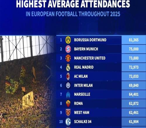 德转列2025欧洲俱乐部场均上座榜:多特居首,拜仁曼联分列二三